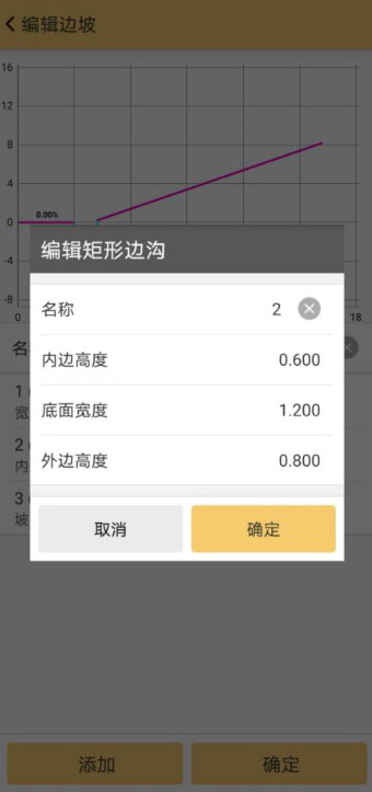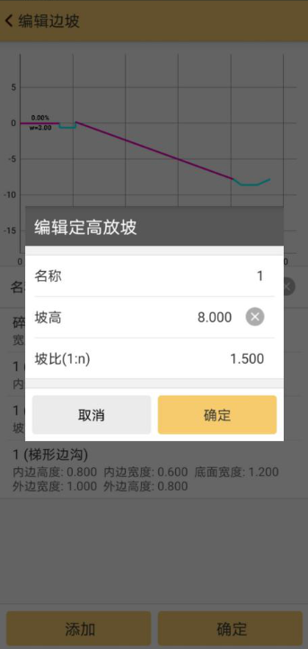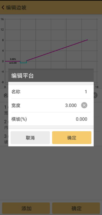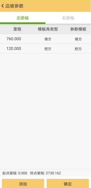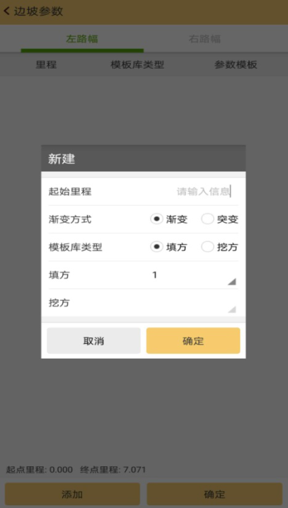 图8 6、回到道路设计界面,点击“边坡参数”,点击”添加”,输入“起始里程”,选择“渐变方式”和“模板库类型”,选择“填方”或“挖方”相应的模板库类型。